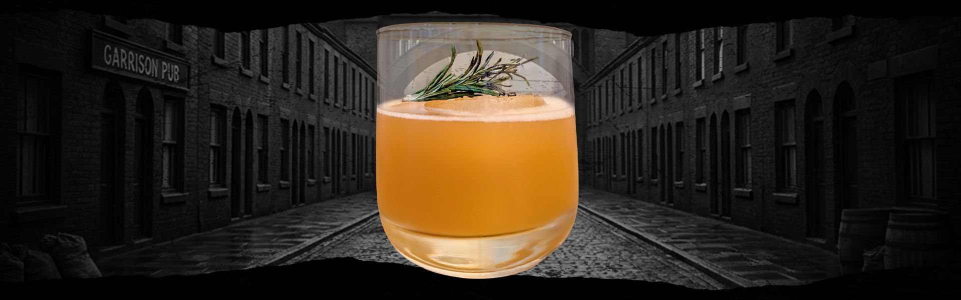 The Garrison Cut is a disciplined, high-stakes pour designed for the head of the table. Pusser’s Gunpowder Proof provides a high-yield, full-bodied backbone that refuses to be buried, while fresh lime and honey syrup strike a sharp balance between grit and polish. The ritual of the charred rosemary binds the scent of woodsmoke directly to the heavy, molasses-driven spirit—mirroring the industrial fog of the Garrison itself—while an optional topper of Dry Irish Cider adds a crisp, rebellious edge. It’s a sophisticated, hard-hitting build that hits with authority and finishes clean.